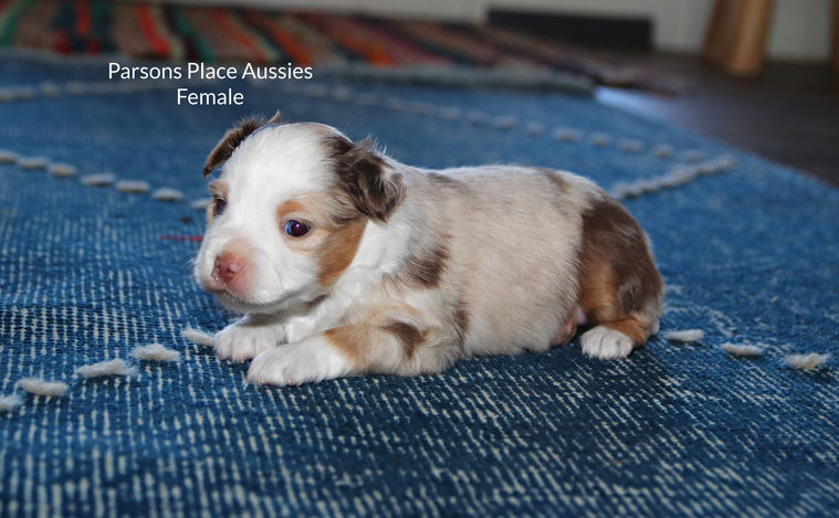 Female - Red Merle, Blue eyes. Gorgeous markings! Estimating currently as a small toy size 11-12" 8-10lbs range. Slightly smaller girl of the 2. Tiny fat little bitty girl. Very calm chill easy going temperament so far. RESERVED