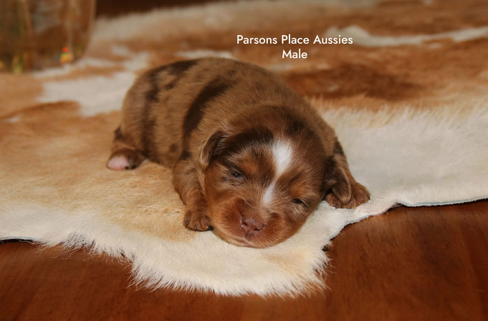 Male- Red Merle, eye color not yet determined. Very Minimal white coloring. HEAVY copper. Gorgeous male! Estimated size, 12.5-13" and 12-15lbs. $1600 pet, Inquire on breeding rights.