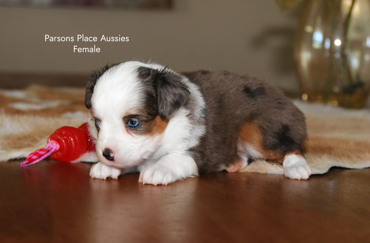 Female- Blue Merle, 2 blue eyes, White collar. She is a very pretty stocky girl. Super bright orange copper markings. Loving sweet personality as of 4 wks. $2500 Full rights. RESERVED