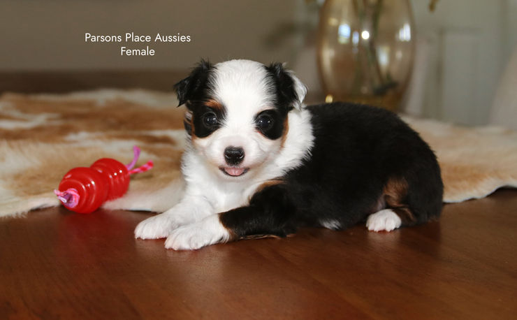 Female - Black Tri, Brown eyes. Smaller puppy in the litter. Super cute and very loving. Small toy size estimated 10 lbs and 11-12" tall. $1600 RESERVED